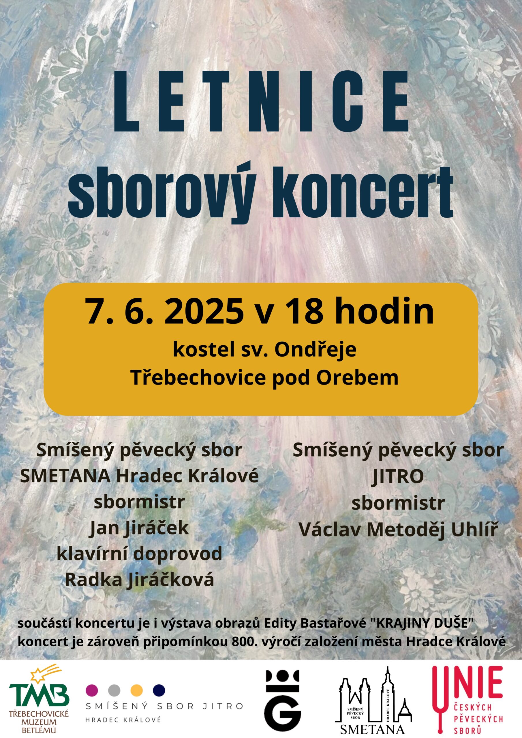 Koncert v Heřmanově Městci ke 100. výročí sboru SMETANA a první koncert jejich Hudebního léta v HM - společně s orchestrem a sborem Konzervatoře Pardubice. Sólisté Jana Lesná, Markéta Štefaniková, Aleš Nehněvajsa a Jan Jiráček.